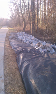 Last year during hurricane Irene we lost a large section of cart path running from our number 2 hole to our number 3 hole. Underneath the cart path there is a creek that runs through and connects to the Patuxent River. As the water level rose during the hurricane the cart path could not withstand the force of the flood waters resulting in the washing away of the cart path and everything underneath. In this picture we are installing the filter fabric. We hope this will help with the erosion if and when the creek rises again.
